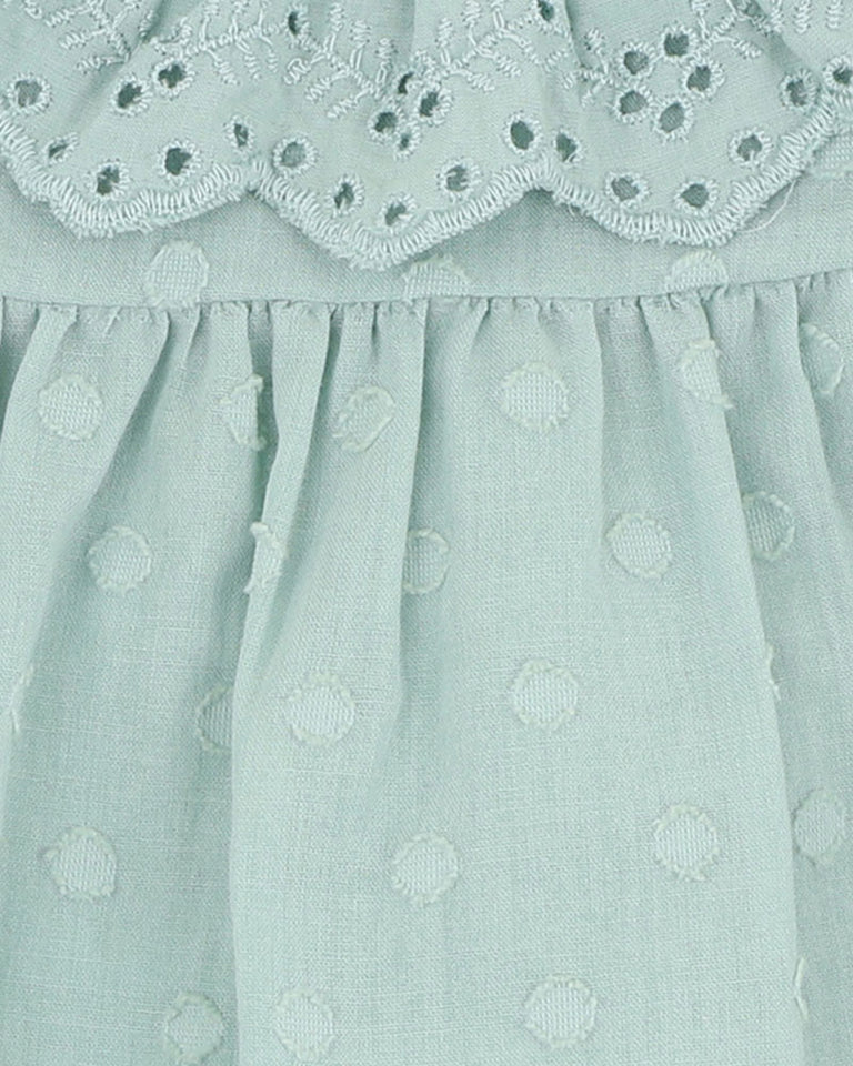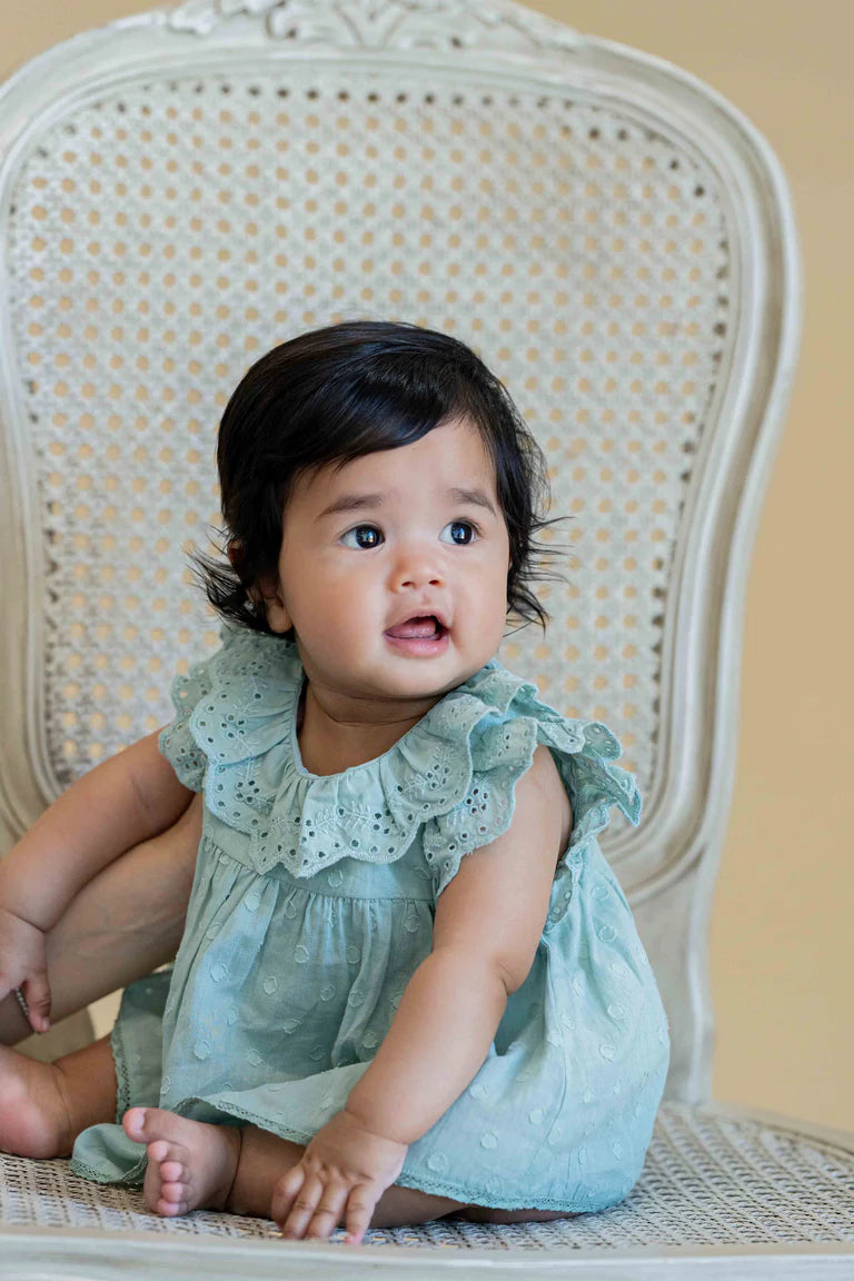 A fresh and feminine addition to your little one's wardrobe, this sweet overlay bodysuit is crafted from soft, breathable cotton with an all-over textured spot weave. Featuring a beautifully detailed broderie anglaise ruffle at the neckline and sleeves, this one-piece offers cuteness and charm with the comfort and practicality of a bodysuit. Designed in a soft dusky sage tone, it includes an attached bodysuit underneath with elasticated legs and snap closures for easy changes.