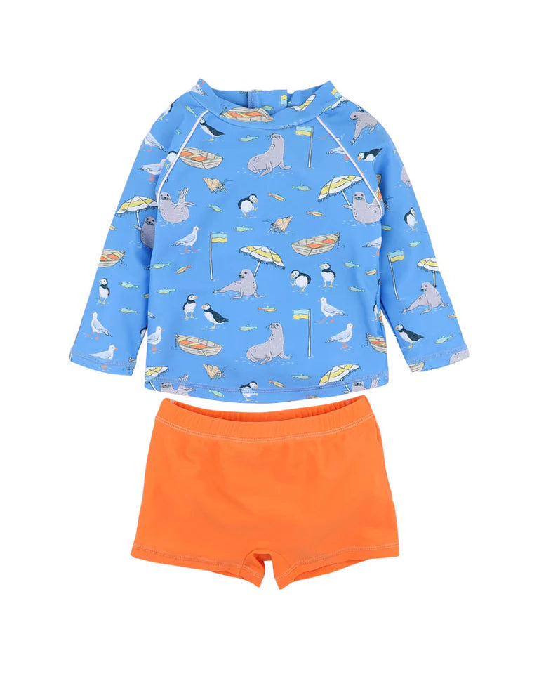 Whether it's paddling in the shallows or a full day at the beach, this sweet two-piece set is ready for sunny adventures. The playful print brings to life a cast of quirky sea creatures, while the practical, easy-wear design keeps little ones comfortable and protected as they splash the day away.